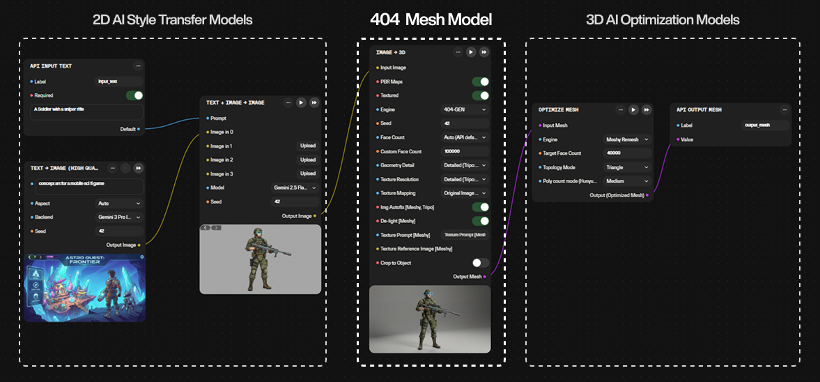 Enterprise studios require more than raw generated assets. Before anything can be used in production, files need to be refined, converted into the right formats, and validated against quality standards. Atlas is designed to handle this process end to end, using orchestration workflows that combine 404-GEN outputs with additional AI models.