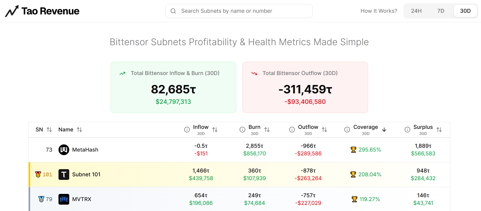 - Surplus is Inflow plus Burn minus Outflow, expressed in both TAO and USD. A positive surplus means the subnet created more economic value than it consumed, and a negative surplus means the network subsidized its existence. Of 128+ active subnets, only three showed positive surplus over the most recent 30-day window: SN101 at a surplus of 940τ ($297K) with 205.51% coverage, MVTRX (SN79) at 108.49% coverage with a 65τ surplus, and MetaHash (SN73) at 289.02% coverage driven almost entirely by miner burn rather than user-facing revenue.