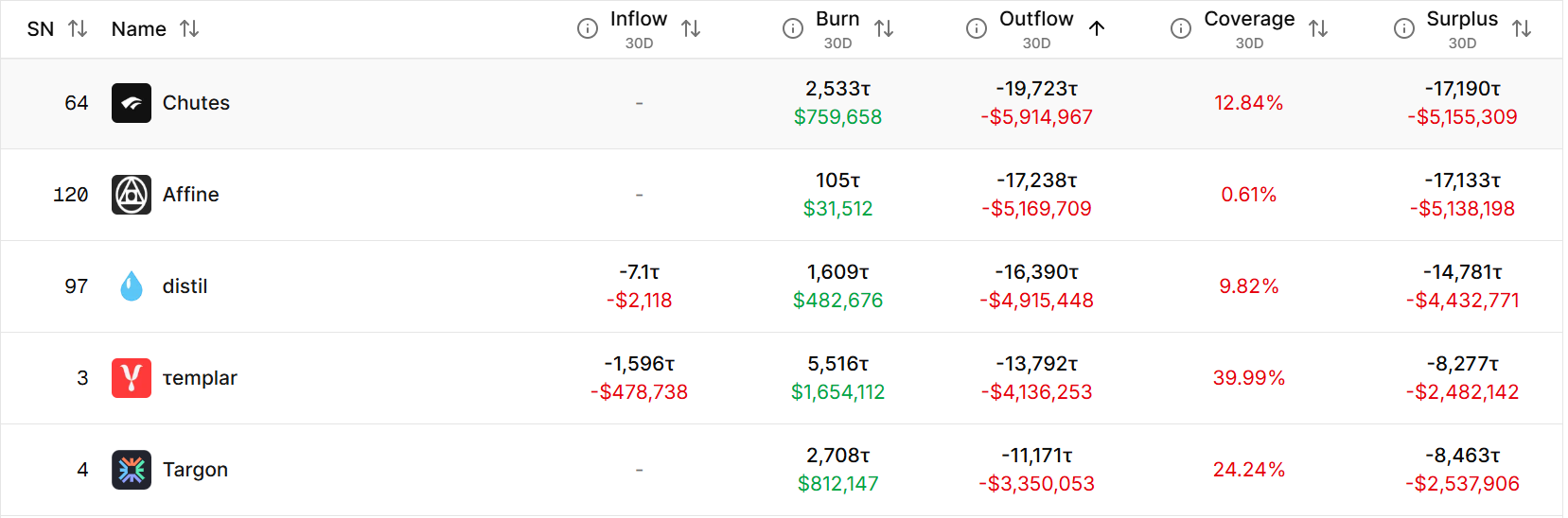 Chutes (SN64) is the most instructive case on the board. It processes more than 5 million daily inference requests and carries the highest outflow on the network at 19,723τ ($5.9M) over 30 days, against a coverage reading of just 12.84%, which means TAO holders are subsidizing roughly $5.1M of Chutes' monthly operating cost. Chutes prices AI inference below cost to acquire users and build market share, a coherent growth strategy if the team converts those 5 million daily requests into paying revenue before the next halving tightens that subsidy further.