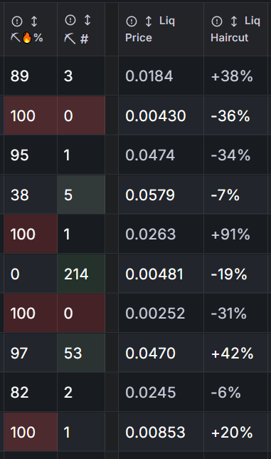 Liq Haircut is the percentage gap between the Liq Price and the market price, and it's the single most important liquidity metric on the site. A -57% haircut on Djinn means the pool price is 57% below the market price, so attempting to exit a meaningful Djinn position through the liquidity pool would cost you 57% of the market value. A -98% haircut on Harnyx means you'd take a near-total loss exiting through the pool, while a haircut close to 0%, or positive like BrainPlay (SN117) at +1% or Sparket.AI (SN57) at +7%, means the pool price and market price are closely aligned, and exit risk is low.