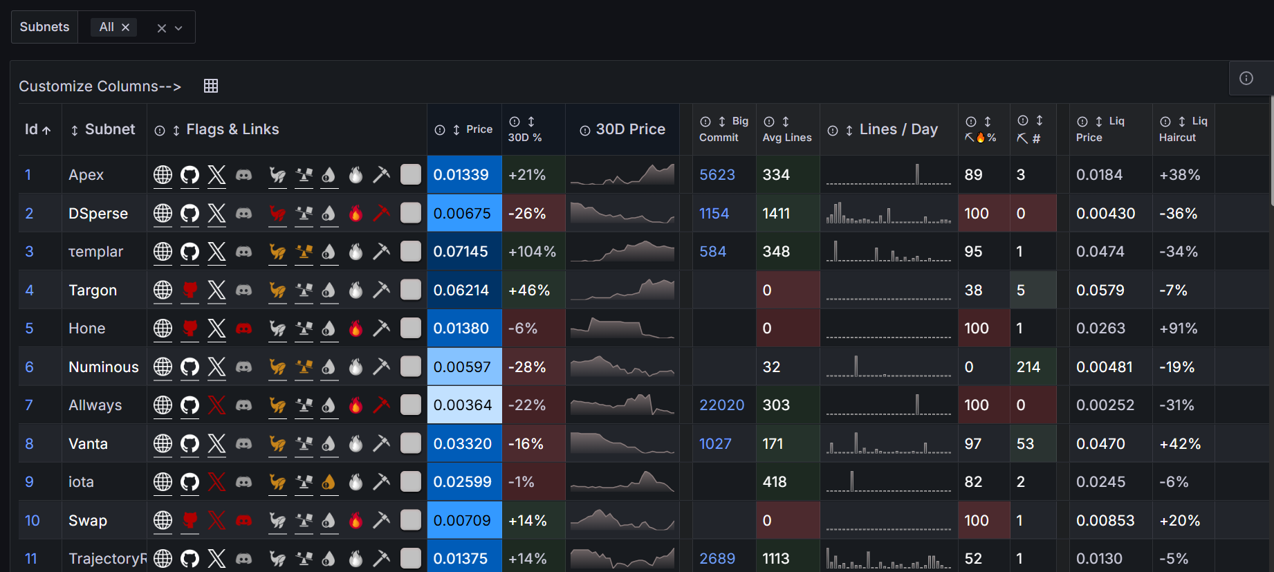 Harnyx (SN67) is the hardest case on the board right now. Its price is down 99% over 30 days, its Liq Haircut sits at -98%, and its Avg Lines sits at 1,050 per commit, which means the development team is still shipping substantial code into a collapsing token with near-zero liquidity. TaoRevenue would tell you whether any paying revenue justifies holding the remaining position. Without reading both tools in sequence, you'd either dismiss Harnyx entirely based on price or overweight the development signal without accounting for what the liquidity data reveals about the exit cost.