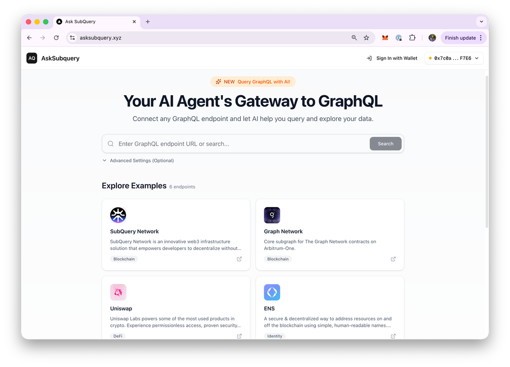 AskSubQuery is SubQuery’s new interface layer that allows developers and users to query blockchain data using natural language instead of technical GraphQL commands. Put more plainly, it's the user-facing experience layer of SubQuery's AI stack.