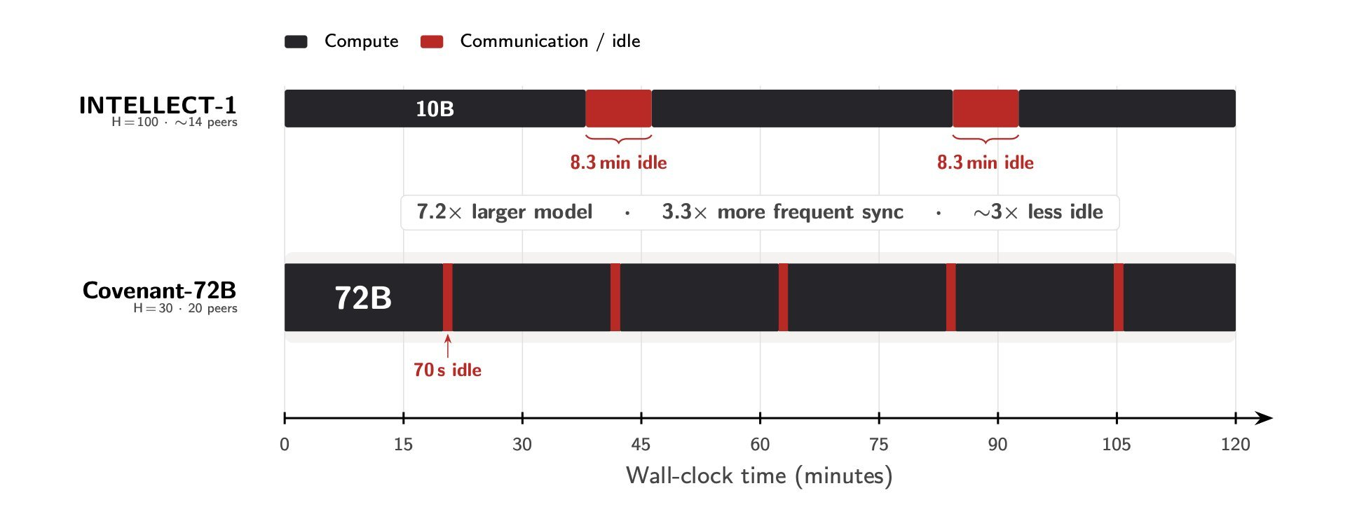 Even though Covenant-72B is 7.2 times larger than a previous decentralized model known as INTELLECT-1, communication delays during training dropped significantly.