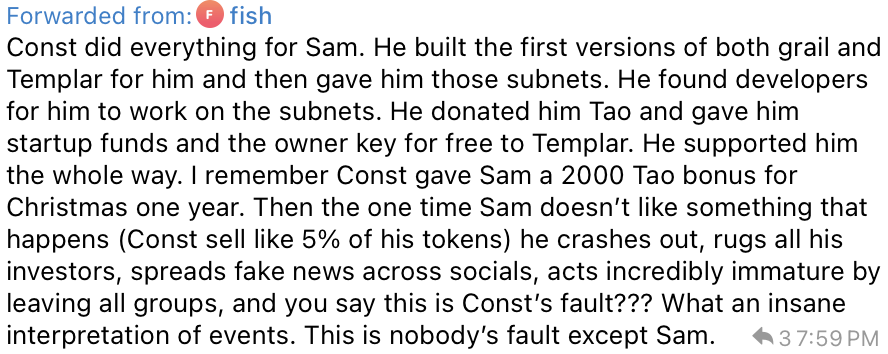 There's also been plenty of CT posts since the exit that have surfaced Sam's recent positive outlook on Bittensor and Const, degrading his claims that he's been unhappy with the ecosystem.