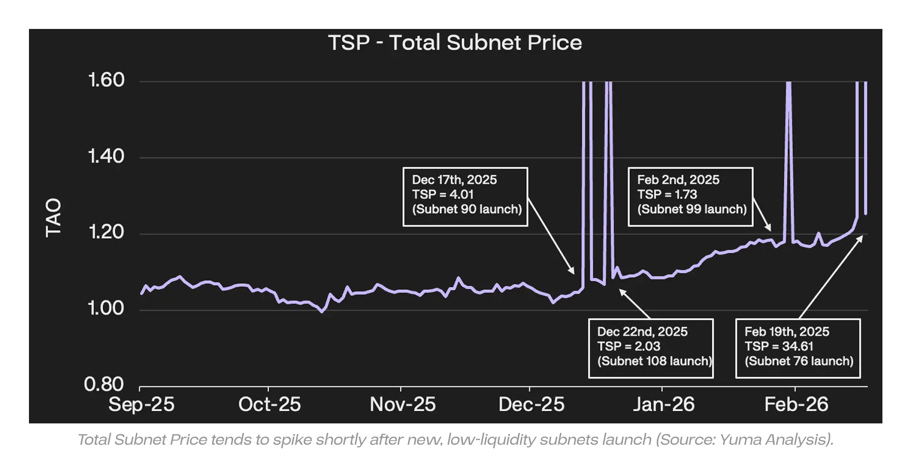 TSP measures the cumulative price of one token from each subnet and can provide a snapshot of value flow between TAO and subnet tokens. However, the metric tends to spike whenever new subnets launch, which can limit its usefulness as a broad market indicator.